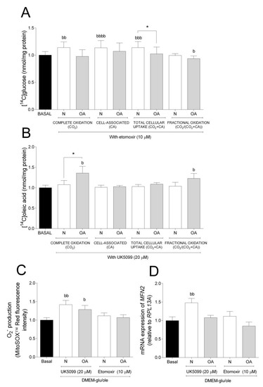 Metabolic flexibility. (A) Effect of 10 µM etomoxir on glucose metabolism. (B) Effect of 20 µM UK5099 on oleic acid metabolism. (C) Effect of 10 µM etomoxir or 20 µM UK5099 on anion superoxide (O2−) production. (D) Effect of 10 µM etomoxir or 20 µM UK5099 on mRNA expression of mitofusin 2 (MFN2 N and OA data included the values for haplogroups H and J combined. All data were obtained from three independent experiments, each with four replicates and two clones per donor. Values are presented as mean ± SEM relative to basal (DMEM-glu/ole, i.e., DMEM 5.5 mM glucose supplemented with 100 µM oleic acid). * Statistically significant difference between N and OA cybrids (* p ≤ 0.05, unpaired t-test). b Statistically significant versus basal (b p ≤ 0.05, bb p ≤ 0.01, bbb p ≤ 0.001, bbbb p ≤ 0.0001 paired t-test). N, healthy cybrids; OA, osteoarthritis cybrids.