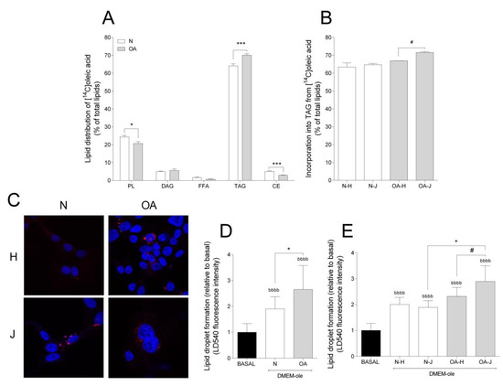 Taking into account that TAG is mainly stored as LDs, intracellular storage depots of neutral lipids [40], LD formation was also analyzed. Addition of oleic acid to cell culture medium was used as an efficient strategy to enhance and study the intracellular accumulation of LDs. Compared to basal, LD formation increased in both groups (Figure 4C,D). Furthermore, N cybrids incorporated less oleic acid into LDs than OA (Figure 4D). In coherence with higher TAG incorporation in OA-J cybrids, LD formation was higher in OA-J compared to OA-H and N-J haplogroups (Figure 4E).
