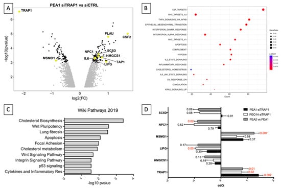 TRAP1 expression modulates genes involved in inflammation and lipid homeostasis. (A) Volcano plot showing the whole genome gene expression changes in PEA1 cells upon siRNA-mediated TRAP1 silencing (black = p < 0.001, light gray = p< 0.01). Relevant transcripts are highlighted, chosen for belonging to the cholesterol pathway or the inflammatory response. (B) Dot-plot representing hallmarks emerging from gene set enrichment analysis of the differentially expressed genes upon siRNA-mediated TRAP1 silencing in PEA1 cells. (C) Gene set enrichment analysis on the list of genes significantly modulated in expression (p < 0.001) upon TRAP1 silencing in PEA1 cells as for the microarray analysis. (D) Real-time RT-PCR analysis of genes involved in the cholesterol metabolic pathway found differentially expressed upon TRAP1 silencing in PEA1 cells according to microarray analyses. PEA1 and PEO14 cells were transfected with nontargeting control siRNA or TRAP1-directed siRNA (siTRAP1) and collected 72 h after transfection. All data are expressed as mean ± standard error of the mean (S.E.M.) of delta-delta Ct (ddCt) from six (PEA1 siTRAP1), three (PEO14 siTRAP1), or four (PEA2 vs. PEA1) independent experiments with technical triplicates each. Numbers indicate the statistical significance (p-value), based on the Student’s t-test (significant values highlighted in red).