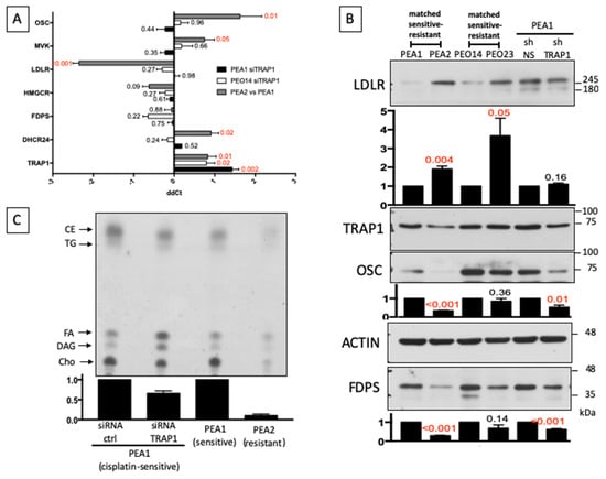 Based on these data, we decided to investigate the cholesterol biosynthetic pathway in drug-sensitive and drug-resistant HGSOC cells and the impact of TRAP1 expression on its regulation. To this aim, we measured incorporation of 14C acetate into cholesterol by thin-layer chromatography [24]. Results showed that the cholesterol synthesis is dramatically reduced in PEA2 cells compared to PEA1, and that TRAP1 silencing in the latter also decreases the incorporation of acetate (Figure 2C). These data are consistent with the reduced expression levels of the enzymes involved in cholesterol synthesis.