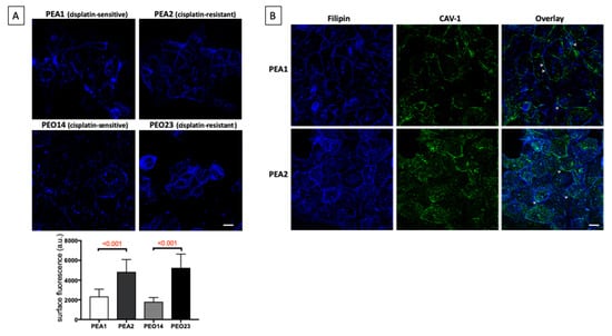 Transition to chemoresistance correlates with an increase of cholesterol at the cell surface. (A) Microscopy analysis of unesterified cholesterol through the visualization of filipin fluorescence in the two matched pair of cisplatin-sensitive/resistant cell lines PEA1/PEA2 and PEO14/PEO23. Maximum projection of Z-slices is shown. Scale bar = 20 μm. The bar graph (lower panel) shows the mean fluorescence intensity (arbitrary unit, a.u.) of filipin at the cell surface. Data are expressed as mean ± Standard deviation (SD) (n > 30). Numbers above bars indicate the statistical significance (p-value) based on Student’s t-test. (B) Representative images of double staining, in PEA1 and PEA2 cells, of unesterified cholesterol (Filipin) with Caveolin-1 (CAV-1). Overlay regions between filipin and CAV-1 stainings are indicated with arrowheads. Scale bar = 20 μm.