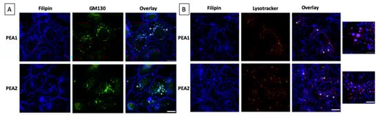 Analysis of cholesterol distribution in chemosensitive and chemoresistant cell lines. Representative images of double immunofluorescence assays. Specifically, PEA1 and PEA2 cells were stained with Filipin and the Golgi marker GM130 antibody (A) or the Lysostracker dye (B). Scale bar = 10 μm. Arrows indicate co-localization areas. In b, higher magnification pictures are shown, scale bar = 5 μm.
