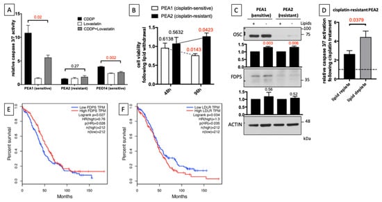 Our results suggest that chemoresistant cells reduce cholesterol synthesis in order to earn drug resistance, and, in parallel, activate compensatory uptake of exogenous cholesterol for membrane composition. Future studies will address mechanisms involved in this process. Starting from this, we measured viability of chemosensitive and chemoresistant cells upon withdrawal of lipids from extracellular medium, by culturing cells in medium supplemented with lipid-deprived serum for 48 and 96 h. Interestingly, we found that the chemoresistant PEA2 cells, showing reduced biosynthesis and increased levels of LDLR, are not sensitive to lipid deprivation, but rather slightly increase their viability (Figure 5B). Accordingly, western blot analysis demonstrate that those conditions trigger significant re-expression of OSC and a slight increase in FDPS levels, suggesting a feedback reactivation of the biosynthetic pathway (Figure 5C). We therefore measured cisplatin-induced apoptosis in PEA2 cells following lipid withdrawal from serum supplementing the culture medium. Strikingly, lipid deprivation significantly increased caspase 3/7 activation following cisplatin treatment (40 μM) (Figure 5D), further supporting the hypothesis that repression of the biosynthetic pathway is functional to the acquisition of drug resistance, and that its re-activation can restore sensitivity. Significantly, an analysis of The Cancer Genome Atlas (TCGA) database, performed with GEPIA (Gene Expression Profiling Interactive Analysis) [26], revealed that low expression of the biosynthetic enzyme FDPS correlates with reduced overall survival in OC patients (Figure 5E), whereas, on the contrary, high expression of LDLR is associated with worse survival (Figure 5F), which is in line with our in vitro observations.