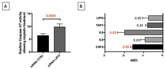 The data shown above, along with our previous observations [7] strongly suggest that OC cells remodel their metabolism reducing lipid biosynthetic pathways and increasing catabolic pathways through the tricarboxylic acid cycle and the oxidative phosphorylation, gaining survival advantage in terms of resistance to apoptosis induced by anticancer drugs. Our analyses highlighted the potential role of LIPG in such metabolic remodeling. For this reason, we explored the impact of LIPG expression on PEA1 sensitivity to cisplatin treatment. Remarkably, siRNA-mediated LIPG silencing significantly increased caspase 3/7 activity upon cisplatin treatment (20 μM for 48 h) (Figure 6A). Interestingly, it has been shown that the LIPG gene is transcriptionally activated by NF-kappaB, a pivotal mediator of inflammatory responses [27]. Considering that we have previously shown that HGSOC cells acquire cisplatin resistance through oxidative metabolism-induced inflammation, we wondered whether the induction of oxidative stress in these cells is sufficient to induce the expression of any of the proinflammatory cytokines previously identified (CSF2, IL6, IL8), the ABC transporter potentially responsible for drug resistance (TAP1) [7], and LIPG itself. To this aim, we measured the expression of these genes in PEA1 cells by qPCR following treatment with H2O2 (20 μM) for 9 h. The results show that all of the genes mentioned above are, to various extents, induced upon treatment, but only CSF2 and IL8 were significantly upregulated (Figure 6B). Further investigations are needed to clarify the possible involvement of LIPG in the inflammatory response induced by oxidative stress.