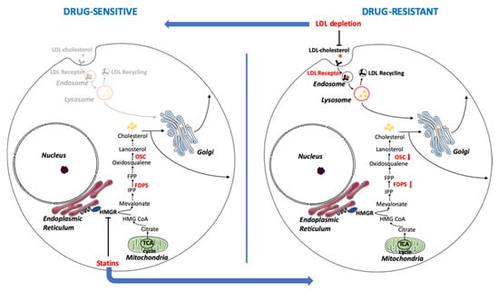 A proposed model for the remodeling of cholesterol metabolism in the transition from a chemosensitive to a chemoresistant phenotype in human ovarian cancer cells. Drug-sensitive cells show significant activation of the cholesterol biosynthetic pathway and transport of cholesterol through the Golgi apparatus, while uptake of exogenous cholesterol through the LDLR is limited. Drug resistant cells, on the opposite, show reduced levels of FDPS and OSC along the biosynthetic pathway and increased LDL uptake. The inhibition of 3-hydroxy-3-methylglutaryl-coenzyme A reductase (HMGCR), the rate-limiting enzyme of the biosynthetic pathway, by statins induces drug resistance, whereas the reduction of LDL recycling and lipid absorption through extracellular lipid withdrawal or LIPG knockdown sensitizes cells to drug-induced apoptosis. Enzymes whose expression has been analyzed in this work are in bold red. IPP = isopentenyl pyrophosphate; FPP = farnesyl pyrophosphate; TCA = tricarboxylic acid. This image was created using images from Servier Medical Art under Creative Commons Attribution 3.0 Unported License (https://smart.servier.com).