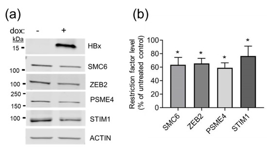 Expression of HBx reduces steady-state levels of putative restriction factors: (a) Representative western blot of plasmid-transfected HEK293T cells ± treatment with dox to induce the expression of HBx, as described in the Materials and Methods section. Cell lysates were separated by SDS-PAGE; were transferred to nitrocellulose filters; and were blotted using antibodies against restriction factors SMC6, ZEB2, PSME4, and STIM1 (Supplementary Table S1). Protein levels were normalized to actin levels (bottom panel). Comparison of treated cells with untreated cells revealed the impact of HBx expression. (b) Graphical representation of western blot results from three independent experiments: The level of each restriction factor in the absence of HBx was set to 100% and compared to the level of that same protein in the presence HBx. Significance was determined by student t test using GraphPad Prism Version 8.1.2. Asterisks indicate p < 0.05.