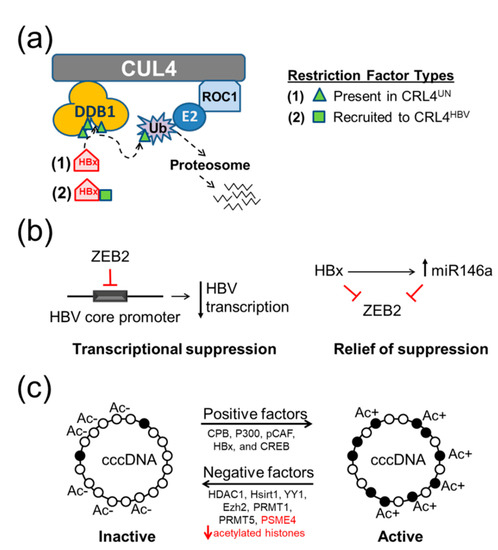 Proposed HBV restriction factor models: (a) Based on results of this study, this model proposes at least two categories of HBV restriction factors. Some HBV restriction factors are already present in the CRL4UN (green triangles), while others are recruited to the CRL4 by HBx (green squares). (b) Proposed model to explain a role for ZEB2 as an HBV restriction factor. Left, ZEB2 is a DNA binding transcriptional repressor previously shown to bind to the HBV core promoter and significantly decrease HBV transcription [73]. Right, HBx relieves ZEB2-mediated transcriptional suppression by upregulating miR146a [107], which promotes HBV replication by targeting ZEB2 [106]. In the current study, we propose that HBx utilizes the CRL4 complex to target ZEB2 for degradation. (c) Proposed mechanism for restriction factor PSME4. Left, Transcriptionally inactive cccDNA has a preponderance of hypoacetylated histones (empty circles) and associates with specific factors ((histone deacetylases (HDACs), transcriptional repressors, and methyltransferases)] such as HDAC1 and Nicotinamide adenine dinucleotide (NAD)-dependent protein deacetylase sirtuin 1 (Hsirt1) [10], yin yang 1 (YY1) and enhancer of zeste homolog 2 (Ezh2) [111], protein arginine methyltransferase 1 (PRMT1) [109], and PRMT5 [110]. Right, Alternatively, transcriptionally active cccDNA contains a preponderance of hyperacetylated histones (filled circles) and associates with other factors including cyclic adenosine monophosphate (cAMP) responsive element binding protein 1 (CREB) [108], CREB binding protein (CBP), P300, P300/CBP-associated factor (pCAF), PSME4 (red font, identified in this study) and HBx [10,11]. We propose that PSME4 is a viral restriction factor because of its ability to degrade acetylated histones [70,71], thereby helping to return cccDNA to an inactive state unless HBx is present to promote the degradation of PSME4.