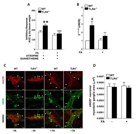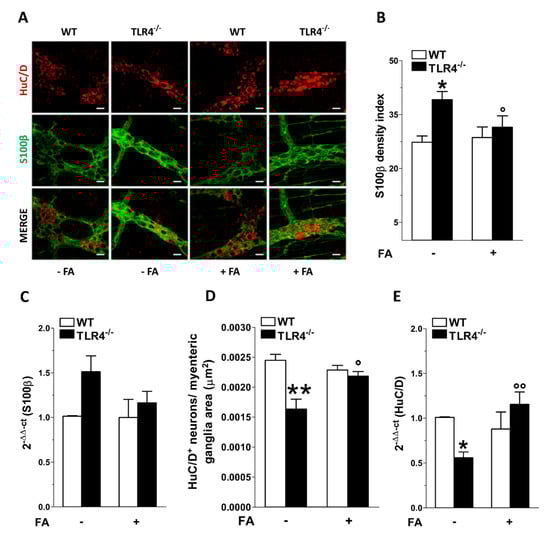 To assess the impact of enteric glia on ENS architecture and function, distal ileum segments from WT and TLR4−/− mice were incubated for 1 h with 10 µM FA at 37 °C with 95% O2/5% CO2. Ileal samples were subjected to neuromuscular function studies and their adjacent tissue segments were used for IHC and quantitative RT-PCR experiments [26].
