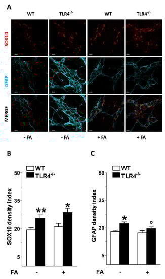 In the LMMPs of TLR4−/− mice, treatment with FA resulted in a significant reduction in GFAP immunoreactivity with no changes in SOX10 density index (Figure 2).
