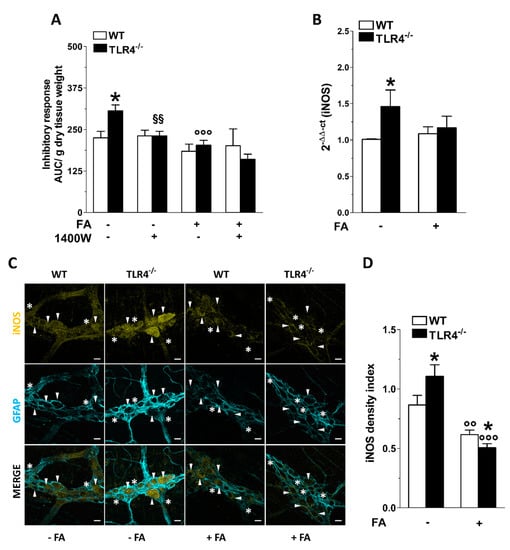 Considering the involvement of iNOS in sustaining part of the NO-mediated relaxation in the gut and given the enhanced immunoreactivity of iNOS in TLR4−/− myenteric ganglia [29], we assessed whether the disruption of the EGCs activity could affect iNOS-mediated inhibitory response. Following iNOS inhibition with 1400 W, the relaxant response of ileal segment from TLR4−/− mice resulted comparable to that of WT mice (Figure 4A). Higher expression of iNOS in ileal specimens of TLR4−/− mice was evidenced by qRT-PCR (+42 ± 3%; Figure 4B). Interestingly, the inhibitory response of ileal segments treated with FA in the presence or absence of 1400 W was comparable between genotypes (Figure 4A), suggesting that in absence of TLR4, NO release is mostly mediated by iNOS expressed by EGCs [24,29] (Figure 4C,D). Accordingly, the disruption of EGCs activity with FA determined a marked reduction of iNOS immunoreactivity and mRNA levels in both genotypes, as shown in Figure 4B–D.