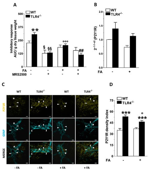 We have previously shown that TLR4−/− mice display a marked increase of P2Y1 receptor (P2Y1R) immunoreactivity in myenteric ganglia and higher ADP-mediated relaxation sensitive to the P2Y1R selective antagonist MRS2500 [29,38]. Therefore, we sought to determine the impact of EGCs activity on purinergic-mediated relaxation in NANC conditions in absence or in presence of FA. The addition of MRS2500 in NANC conditions determined a reduction in the inhibitory response of TLR4−/− ileal segments (-55 ± 2%), resulting in a response comparable to that of WT mice (Figure 5A). The combination of FA and MRS2500 determined a reduction of NANC-mediated relaxation similar to that obtained with MRS2500 alone, in both WT and TLR4−/− mice (Figure 5A). qRT-PCR data showed no changes of P2Y1R mRNA transcripts in TLR4−/− ileal tissue that was not affected by FA treatment (Figure 5B). The increased immunoreactivity of P2Y1R (+41 ± 3%), shown in the myenteric plexus of TLR4−/− mice ileum, was partially blunted by FA treatment, and remained significantly higher compared to that of WT (Figure 5C,D).