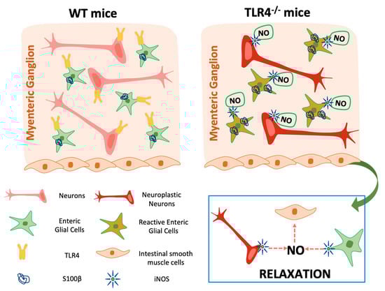 In the ENS, the major inhibitory NANC neurotransmitter is endogenous NO that can be generated by the three different enzymes, nNOS, endothelial NOS (eNOS), and inducible NOS (iNOS). More than 90% of the total NOS in the small intestine is nNOS, expressed by nitrergic neurons, mostly distributed in the myenteric plexus, which act as inhibitory interneurons or inhibitory motoneurons [42]. However, iNOS isoform is also constitutively present and accounts for less than 10% of the total enteric NOS activity whereas eNOS isoform is barely detectable [42,43]. In case of inflammation, the induction of iNOS produces a large amount of NO in epithelial and immune cells as well as in neurons and EGCs of the ENS, determining altered epithelial function and water and ion transport dysregulation with consequent intestinal dysmotility [24,33,34,42,44,45,46]. Indeed, we have recently shown that, in NANC conditions, isolated ileal segments from TLR4−/− mice display increased EFS-mediated relaxations associated with a proportional increase of nNOS+ neurons and an increase of both iNOS activity and immunoreactivity, whereas in WT mice the inhibitory tone was mainly dependent on nNOS-mediated NO production [29]. To better understand the role of EGCs in the neuromuscular function, we evaluated the effect of FA in the inhibitory response following 10 Hz EFS-stimulation. After FA treatment, in WT mice we found a slight but not significant reduction of inhibitory response to indicate that EGCs do not participate in the ileal relaxation during homeostasis, confirming the data found by Aubé et al. (2006) [47] in jejunal segments from a transgenic model of glial ablation. In TLR4−/− mice, the disruption of EGC metabolism restored an inhibitory response comparable to WT mice, supporting a role for enteric glia in intestinal physiology. Moreover, iNOS activity in TLR4−/− mice was abolished following in vitro FA treatment, confirming that TLR4 signaling is involved in controlling EGCs activity and iNOS expression. Accordingly, MacEachern et al. (2015) [24] showed that FA could prevent NO release specifically from iNOS, suggesting that FA directly targets enteric glial metabolism. Our current data suggest that, in the absence of TLR4 signaling, EGCs are in an activated state, leading to: (i) reactive gliosis (higher S100B content), (ii) neuroplastic changes (reduced number of HuC/D+ neurons), and (iii) release of iNOS-derived NO, principally from myenteric glia (Figure 7).
