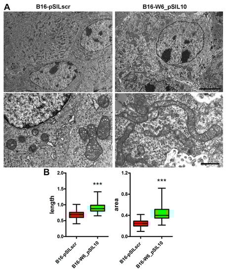 Depending on the cell type and physiological conditions, mitochondria can be present either as numerous morphologically distinct small organelles, or they can form large interconnected networks [,]. To assess the relationship between A-SMase expression and mitochondrial morphology, we used transmission electron microscopy to analyse the shape of the mitochondria of explanted murine melanoma allografts. To this end, mice were injected subcutaneously with B16-W6_pSIL10 cells, a cell clone obtained by constitutively knocking-down A-SMase in B16-F1 cells [,,]. B16-pSILscr cells transfected with the scrambled vector were used as a control. By ultrastructural analysis we found that control tumours presented mostly rounded and small mitochondria, while elongated and more tubular mitochondria accumulated in B16-W6_pSIL10 melanomas (Figure 1A). The measurement of the mitochondria mean length and area confirmed that these organelles were significantly longer and larger in the absence of A-SMase (Figure 1B). The effect of A-SMase expression levels on mitochondrial shape was also confirmed in allograft melanomas derived from the B16-B9 clone, in which A-SMase is expressed naturally at low levels. In these tumours, mitochondria appear round, rather elongated in shape, and with a larger area (Supplementary Figure S1A).