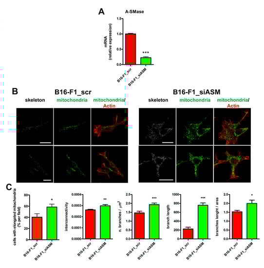 Given our initial observation, we aimed to determine whether the differences in mitochondrial size observed in explanted tumours (Figure 1A,B) depended on A-SMase expression and, if so, the mechanism behind this event. To this end, we analysed in vitro the effect of A-SMase silencing on mitochondrial morphology by transiently transfecting B16-F1 cells with a siRNA specific for A-SMase (B16-F1_siASM cells) (Figure 2A) []. We found that the downregulation of A-SMase resulted in an increased percentage of cells with elongated mitochondria which were characterised by augmented interconnectivity, number of branches and branch length compared to scrambled control (B16-F1_scr) (Figure 2B,C). These results are in line with those obtained in the two clones derived from B16-F1 cells expressing A-SMase at low (B19-B9) and high levels (B16-W6). B19-B9 cells displayed a mitochondrial network with elongated mitochondria, similar to that observed in B16-F1_siASM cells, while B16-W6 showed more rounded mitochondria (Supplementary Figure S1B). All these data confirm further that A-SMase expression affects mitochondrial morphology.
