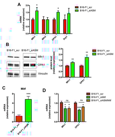 To better understand this mechanism, we investigated whether the microphtalmia-associated transcription factor (Mitf), a key target of A-SMase action in melanoma [], was involved in mitochondrial dynamics and their changes. As shown in Figure 3C, we found increased levels of Mitf mRNA in B16-F1_siASM cells when compared to B16-F1_scr cells (Figure 3C), further confirming its dependency on A-SMase expression. Notably, the silencing of Mitf (Figure 3D) in B16-F1 cells induced a significant inhibition of Mfn1 and OPA1 mRNA expression (Figure 3D), therefore acting, as expected, in an opposite manner to A-SMase. To further explore the Mitf-dependency in the context of the A-SMase pathway, we silenced A-SMase and Mitf together in B16-F1 cells (B16-F1_siASM/siMitf) (Supplementary Figure S2A,B), finding that silencing Mitf completely abolished the effect of A-SMase down-regulation on Mfn1 and OPA1 expression (Figure 3D).