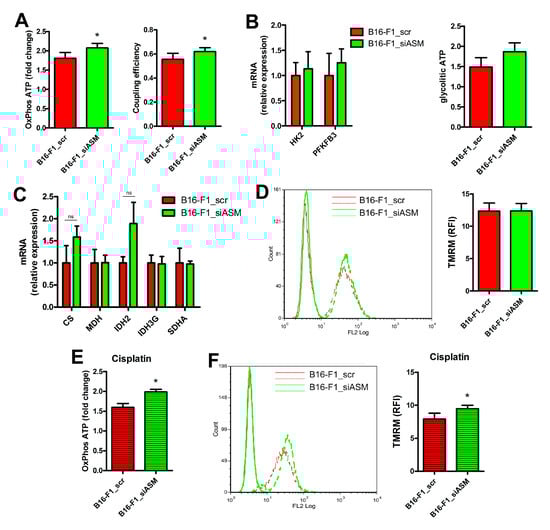 A-SMase silencing reduces the sensitivity to Cisplatin of B16 melanoma cells []. Therefore, we assessed whether mitochondria could be involved in melanoma cell response to the chemotherapeutic drug. Cisplatin (10 μg/mL for 16 h) enhanced OxPhos ATP production and mitochondrial membrane potential in B16-F1_siASM cells compared to B16-F1_scr (Figure 4E,F). This indicates that A-SMase has a role in the cytotoxic response to Cisplatin, and that this goes through the activation of mitochondrial pathways.