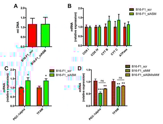 A-SMase downregulation increases mitochondrial biogenesis. (A) Analysis of mtDNA of B16-F1_scr and B16-F1_siASM cells (n = 6). (B) qPCR of COX I, COX IV, CYT B, CYT C and ATPase on mRNA extract from B16-F1_scr and B16-F1_siASM cells (n = 4). Data are expressed as fold change over B16-F1_scr. (C) qPCR of PGC-1alpha and TFAM on mRNA extract from B16-F1_scr and B16-F1_siASM cells (n ≥ 5). Data are expressed as fold change over B16-F1_scr. * p < 0.05 vs. B16-F1_scr. (D) qPCR of PGC-1alpha and TFAM on mRNA extract from B16-F1_scr and B16-F1_siMitf and B16-F1_siASM/Mitf cells (n ≥ 5). ** p < 0.01, *** p < 0.001 vs. B16-F1_scr.