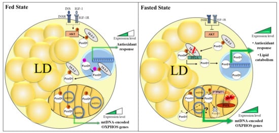 - Lettieri-Barbato, D.; Ioannilli, L.; Aquilano, K.; Ciccarone, F.; Rosina, M.; Ciriolo, M.R. FoxO1 localizes to mitochondria of adipose tissue and is affected by nutrient stress. Metabolism 2019, 95, 84–92. [Google Scholar] [CrossRef]