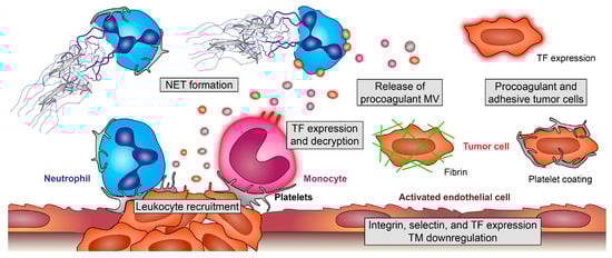 Thrombus formation in larger vessels, like atherothrombosis and deep-vein thrombosis (DVT), may also be propagated by immunothrombotic events [69,70]. Especially, inflammation induced TF expression on innate immune cells is a major contributor to DVT [71]. Moreover, leukocytes and their associated microparticles are responsible for degradation of the TF pathway inhibitor (TFPI), and thereby, they accelerate TF-induced thrombotic events even more [72]. Further, platelets get activated by tumor cells themselves or the proinflammatory tumor microenvironment. During aggregation, platelets release a plethora of chemokines that support the recruitment of leukocytes to the site of injury [73]. They also secrete the protein disulphide isomerase, which supports the activation of leukocyte-derived TF [74].
