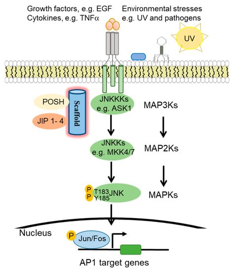 JNK proteins are highly responsive to a diverse array of cellular stimuli, including inflammatory cytokines, growth factors, UV radiation, bacterial, and viral infections, heat shock, and osmotic and genotoxic stresses [6,7,8,9] (Figure 1). JNK is activated by JNKKs (JNK kinases), which in turn is regulated by JNKKKs (JNK kinase kinases) [10]. Specifically, JNK is activated by upstream MAPK2K (MKK4 and MKK7) via phosphorylation of the threonine and tyrosine residues of the conserved ThrProTyr (TPY) motif [11,12,13]. MAPK2Ks are subject to regulation by further upstream MAP3K and MAP4K proteins, as well as scaffold proteins such as the JNK interacting proteins (JIP1, JIP2, and JIP3) [14], SH3 proteins (e.g., POSH) [15], and the IκB kinase complex-associated protein (IKAP) [11,16,17]. Upon activation, JNK phosphorylates downstream target proteins such as the transcription factor activator protein-1 (AP1) family proteins, activating transcription factors (ATF), and (ETS Like-1 protein) Elk1 [13].