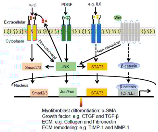 In summary, JNK is a common mediator of pro-fibrotic signals, including TGFβ, PDGF, STAT3, and Wnt signaling pathways (Figure 4). While JNK is a potential therapeutic target for the treatment of fibrotic diseases such as scleroderma [92], further studies are needed to characterize JNK subunit and cell type-specific effects on the pathogenesis of fibrosis and immunological reactions.