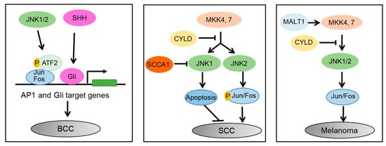 In summary, JNK proteins play important and distinct roles in different skin cancers (Figure 5). In BCC, JNK1/2 activates Jun/Fos, and enhances their interaction with phosphorylated ATF2, which then enhances SHH/Gli induced tumorigenesis. In SCC, MKK4/7 activates JNK1 and JNK2. JNK1 induces apoptosis, whereas JNK2 promotes carcinogenesis in an AP1-dependent manner. SCCA1 promotes SCC via inhibition of JNK1, while CYLD inhibits SCC via suppression of JNK2/AP1 cascade. In melanoma, the MALT1, MKK4/7, and JNK/AP1 signaling cascade promotes melanoma cell proliferation and migration, whereas CYLD inhibits it.