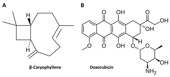 Molecular structure of the natural sesquiterpene β-caryophyllene (A) and the anticancer drug doxorubicin (B).
