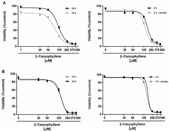 In the range of the tested concentrations (i.e., 5–500 μM corresponding to 1–100 μg/mL), β-caryophyllene produced slight cytotoxic effects in all the experimental schedules and in both cell lines (Figure 2). The cytotoxicity power of β-caryophyllene under the metronomic treatments resulted lower than that found after the long-term exposures in both cell lines. Indeed, the sesquiterpene produced early toxicity signs (about 20% inhibition of cell viability vs. control) in Mz-ChA-1 cells at concentrations higher than 50 μM after the long-term exposures of 24 h and 72 h, whereas it resulted nontoxic up to 125 μM under the metronomic schedule (Figure 2A).