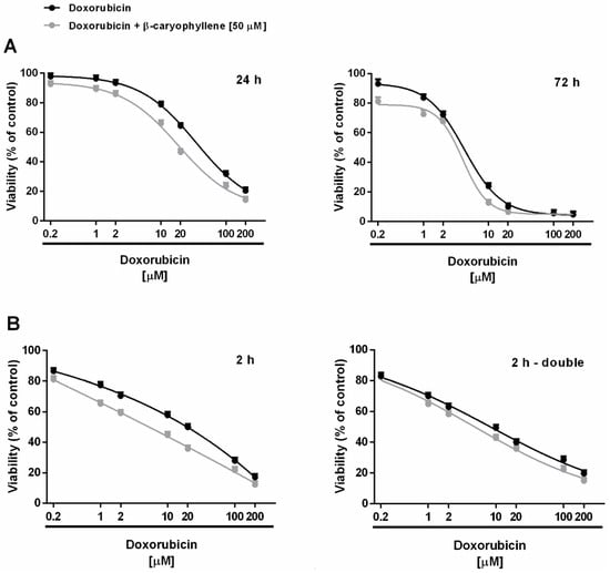 Cytotoxicity of doxorubicin and its combination with β-caryophyllene in H69 noncancerous cholangiocytes. (A) Single long-term exposures of 24 h and 72 h. (B) Metronomic schedule: the cells were subjected to a single and/or double repeated short exposure of 2 h followed by a recovery time of 72 h. Data are expressed as mean ± SE (standard error) of at least two experiments in which each treatment was tested at least in triplicate (n = 6).