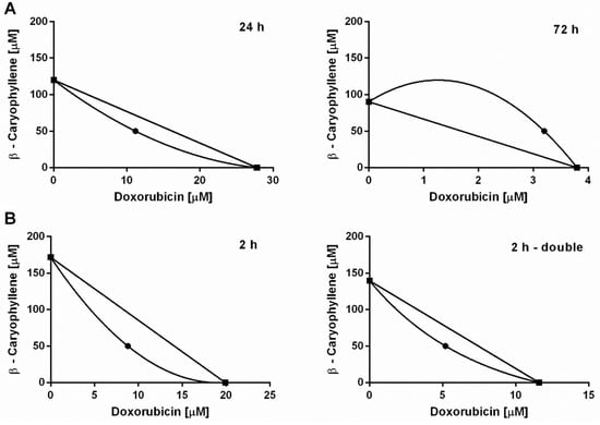 According to Di Giacomo et al. [], the interaction nature between doxorubicin and β-caryophyllene was also evaluated by means of the combination index (CI) and the isobolographic analysis (Figure 4). A lower than 1 value of CI highlights a synergistic interaction, while additivity occurs when this value is equal to 1; conversely, a higher than 1 CI denotes an antagonism. Under our experimental conditions, the combination of doxorubicin plus β-caryophyllene determined CI values of 0.82 and 1.44 after the long-term exposures of 24 h and 72 h, while CI values of 0.73 and 0.81 after a single and double repeated short metronomic exposures, respectively.