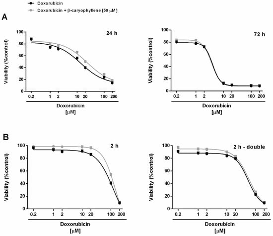 For evaluating the chemosensitizing properties, the combination of doxorubicin and a nontoxic concentration (about the IC10 concentrations, at which about a 10% lowering of cell viability occurred) of β-caryophyllene was administered to cells.