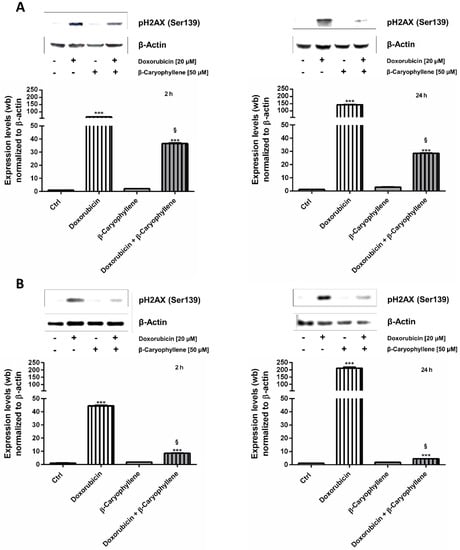 The obtained results highlighted that in spite of null effects of β-caryophyllene alone, doxorubicin markedly affected the levels of γH2AX in both Mz-ChA-1 and H69 cells after either a short exposure of 2 h and a long-term treatment of 24 h (Figure 6A,B). Particularly, in Mz-ChA-1 cells, doxorubicin produced an increase in the γH2AX levels by about 60- and 140-fold after 2 h and 24 h respectively, compared the control (Figure 6A). Similarly, in noncancerous H69 cholangiocytes about a 40- and 200-fold increase of γH2AX with respect to control was achieved after 2 h and 24 h, respectively (Figure 6B).