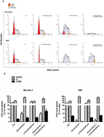 Combining β-caryophyllene and doxorubicin retained the cell cycle profile of the anticancer drug, except for a slight reduction (1.1-fold vs. doxorubicin) of S-phase in Mz-ChA-1 cells and a marked increase of G2/M phase in both cell lines (Figure 7). Particularly, G2/M phase was enhanced by almost 3-fold with respect to doxorubicin alone in Mz-ChA-1 cells, being also 3-fold higher than the control. In the H69 cells, a significant 4-fold enrichment of cells in G2/M phase compared doxorubicin also occurred, restoring the same level in the control. The obtained results highlighted that β-caryophyllene contributed to the S-phase cell cycle arrest induced by doxorubicin and also blocked cells in G2/M phase. Comparing cholangiocarcinoma and noncancerous cholangiocytes, we also found that despite similar levels of both G0/G1 and S phases, G2/M resulted lowered by at least 2-fold in Mz-ChA-1 cancer cells with respect to the H69 cholangiocytes (Figure 7), thus suggesting that a lowered G2/M phase arrest can support the progression of cholangiocarcinoma cells.