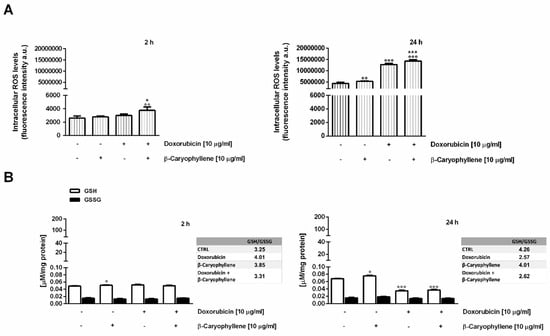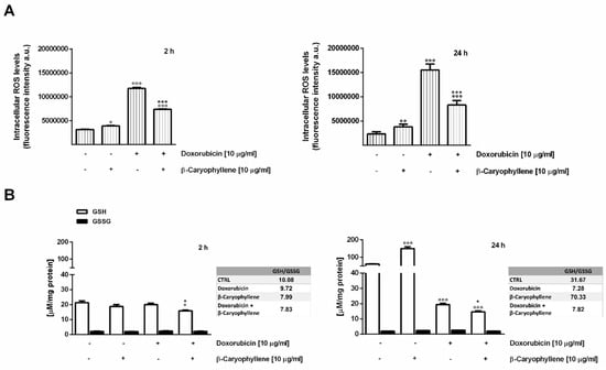 When the sesquiterpene was assessed in combination with doxorubicin, ROS levels were found reduced by almost 2-fold under both time schedules and a further lowering (about a 1.3- and 4-fold reduction after 2 h and 24 h exposure vs. doxorubicin) of GSH amount with respect to doxorubicin occurred (Figure 8A,B). Accordingly, GSH/GSSG ratio resulted lowered by 1.3- and 4 -fold in the presence of doxorubicin or its combination with β-caryophyllene after 2 h and 24 treatments; conversely, β-caryophyllene alone was able to increase this ratio by about 2-fold.