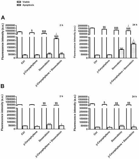 As for the other parameters, apoptosis was measured in both the cell lines after both 2 h and 24 h exposure to doxorubicin, β-caryophyllene and their combination; also, viable cells were detected in the same analysis by staining them with specific probe for apoptotic and viable cells. Particularly, apoptosis was detected by using a fluorochrome-conjugated annexin V that specifically binds to phosphatidylserine, a cell protein that is translocated from the cytoplasmic face of the plasma membrane to the cell surface during early apoptosis, thus being a signal of a biomembrane phospholipid asymmetry loss. Furthermore, the nonfluorescent carboxyfluorescein diacetate (CFDA) probe was employed to distinguish viable cells, being it able to be taken up by cells, then hydrolyzed by esterases, producing a fluorescent 6-carboxyfluorescein (6-CF) metabolite.
