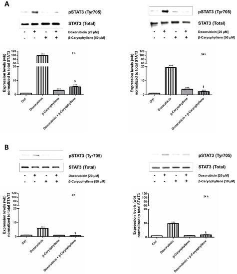 To perform the analysis, the cells were seeded in 6-well plates, then subjected to the treatment with β-caryophyllene (50 µM) and doxorubicin (20 µM), alone and in combination, for the required time exposure, then harvested by centrifugation and washed in PBS. A lysis buffer, containing SDS (2% w/w), Tris-hydrochloride (20 mM; pH 7.4), urea (2 M), glycerol (10% w/w), sodium orthovanadate (2 mM), DTT (10 mM) and a protease inhibitors cocktail (1:100 dilution) was used to achieve the cell protein separation. The separated proteins were resolved by SDS-PAGE 10% TGX FastCast™ Acrylamide gel (BioRad, Segrate, Italy) and transferred on PVDF membranes (BioRad, Segrate, Italy) by using a Trans-Blot® Turbo™ Transfer System (BioRad, Segrate, Italy). The membranes were blocked with a 0.2% w/v I-block (Thermo Fisher Scientific, Rodano, Italy) in Tris-buffered saline containing 0.05% Tween-20 (TBS-T), then stained with the desired primary antibodies. Particularly, to detect the phosphorylated histone H2A variant H2AX at serine 139, the cells were incubated overnight with the anti-phospho-histone H2AX (Ser 139) antibody (rabbit antibody; SC-101696 from Santa Cruz Biotechnology), while phosphorylation of STAT3 on tyrosine 705 residue was highlighted after 1 h incubation with the anti-phospho-STAT3 (Tyr705) antibody (rabbit antibody; 9145S from Cell Signaling Technology, EuroClone, Pero, Italy). After rinsing three times in TBS-T to remove unbound primary antibody, the membranes were incubated for an additional hour with the appropriate horseradish peroxidase- or alkaline phosphatase-conjugated secondary antibody (Jackson ImmunoResearch, Pero, Italy). The peroxidase signal was detected using a ECL Fast Femto reagent (Immunological Science, Roma, Italy) and acquired by a Molecular Imager® ChemiDoc™ MP System (Bio-Rad, Segrate, Italy), while the intensity of protein bands was quantified by the ImageJ software (ImageJ 1.52n, National Institutes of Health, Bethesda, MD, USA). The alkaline phosphatase signal was detected with BCIP/NBT reagents (Carl Roth, Milano, Italy, CAS No. 298-83-9 and 6578-06-9). β-actin (total extracts) was used as normalization protein for phospho(Ser 139)-histone H2AX, whereas phospho(Tyr705)-STAT3 was normalized against total STAT3 levels (anti-STAT3 total mouse antibody; 9139S from Cell Signaling Technology, EuroClone, Pero, Italy). Each experiment was performed at least in three replicates.