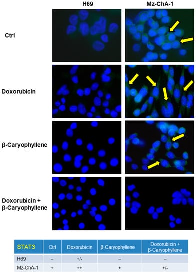 Oxidative stress, DNA damage and apoptosis are closely regulated by STAT3 [], a cytoplasmic transcription factors directly implicated in CCA carcinogenesis and also considered as a marker of CCA poor prognosis [,,]. A feedback activation of STAT3 has been also found engaged by anticancer drugs, like doxorubicin, leading to drug-resistance []. In this context, we also evaluated if a modulation of STAT3 activation could mediate the chemosensitizing and chemopreventive effects of β-caryophyllene in normal and cancer cholangiocytes.