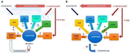 Cholangiocarcinoma (CCA) is an aggressive group of biliary tract cancers, characterized by late diagnosis, low effective chemotherapies, multidrug resistance, and poor outcomes. In the attempt to identify new therapeutic strategies for CCA, we studied the antiproliferative activity of a combination between doxorubicin and the natural sesquiterpene β-caryophyllene in cholangiocarcinoma Mz-ChA-1 cells and nonmalignant H69 cholangiocytes, under both long-term and metronomic schedules. The modulation of STAT3 signaling, oxidative stress, DNA damage response, cell cycle progression and apoptosis was investigated as possible mechanisms of action. β-caryophyllene was able to synergize the cytotoxicity of low dose doxorubicin in Mz-ChA-1 cells, while producing cytoprotective effects in H69 cholangiocytes, mainly after a long-term exposure of 24 h. The mechanistic analysis highlighted that the sesquiterpene induced a cell cycle arrest in G2/M phase along with the doxorubicin-induced accumulation in S phase, reduced the γH2AX and GSH levels without affecting GSSG. ROS amount was partly lowered by the combination in Mz-ChA-1 cells, while increased in H69 cells. A lowered expression of doxorubicin-induced STAT3 activation was found in the presence of β-caryophyllene in both cancer and normal cholangiocytes. These networking effects resulted in an increased apoptosis rate in Mz-ChA-1 cells, despite a lowering in H69 cholangiocytes. This evidence highlighted a possible role of STAT3 as a final effector of a complex network regulated by β-caryophyllene, which leads to an enhanced doxorubicin-sensitivity of cholangiocarcinoma cells and a lowered chemotherapy toxicity in nonmalignant cholangiocytes, thus strengthening the interest for this natural sesquiterpene as a dual-acting chemosensitizing and chemopreventive agent.