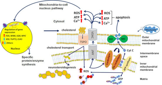 An increase in mitochondrial membrane permeability is a characteristic symptom of mitochondrial impairment in the brain [135]. A well-known element for this mechanism is the mitochondrial permeability transition pore (mPTP), which is a nonspecific high-conductance channel that is permeable to molecules up to 1.5 KDa [136]. The mPTP is considered to be formed by, or part of, a multiprotein complex. Just four proteins are mentioned here for illustration: (1) The voltage-dependent anion channel (VDAC) is located in the OMM. As its name implies, VDAC is a high-conductance channel, thus it is essentially the core of the mPTP. (2) The adenine nucleotide transporter (ANT), located on the inner mitochondrial membrane, which, similar to VDAC, can also work as a channel for small molecules. (3) Cyclophilin D (CypD) a mitochondrial matrix protein. Lastly, (4) very much to our interest, the translocator protein TSPO, an OMM protein, is very closely associated with VDAC and ANT [1,2,137]. mPTP is opened by mitochondrial calcium overload, oxidative stress, changes in the pH, and ROS [11,138]. Transient openings of this pore induce the release of excess calcium accumulated in the mitochondrial matrix [135]. However, when mPTP is constantly open it causes collapse of the mitochondrial membrane potential (ΔΨm), leading to opening of the Bak/Bax channel and thus allowing for the release of pro-apoptotic factors, leading to cellular death [14,15,139]. Our studies have shown that TSPO is a major component for the induction of programmed cell death and modulation of gene expression via opening of the mPTP (e.g., see Figure 1).