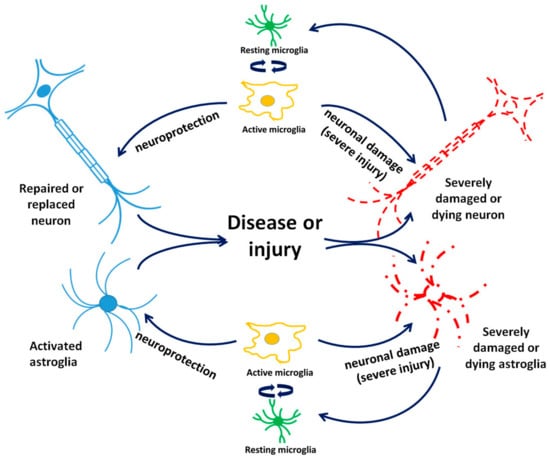 Traumatic brain injuries (TBIs) are mostly characterized as disturbances in the normal physiology and structure of the brain caused predominantly by extrinsic mechanical insults. These conditions are often associated with neuronal, axonal, and vascular damage, which provoke microglial activation, including cytokine release and ROS generation, as primary self-defense responses of the brain [160]. Injury induces interlooping vicious cycles of neuronal and astrocytic cell death, cell damage, and cell activation driving microglia activation, which in turn causes additional progressive cell damage and cell death [29,161]. First of all, by its mechanical force alone, an impact can induce neuronal and astrocytic damage and, depending on the severity of the impact, may include astrocytic death, neuronal death, and axon degeneration. Subsequently, the death, damage, and activation of neurons and astrocytes typically induce microglial activation [162]. Acute microglial activation can serve to protect neurons and astrocytes from additional damage and/or enable the reversal of damage [163]. However, depending on the severity of the TBI, chronic microglial activity after TBI can induce progressive brain damage. Thus, microglial activation can serve to either protect brain tissue from damage, or to cause brain damage [29]. Further, the self-repairing mechanisms of neurons and effects originating from activated microglia and/or astrocytes can help neurons to survive and even regenerate axons, while the activation of mechanisms associated with programmed cell can cause brain tissue damage (Figure 2 and Figure 3) [29].