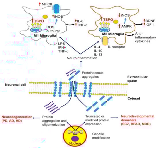 Cellular pathology of neurodegenerative and neurodevelopmental diseases and its correlation with microglial response and modulation of TSPO ligand-binding potentials. Neurodegeneration initiated by cellular protein modification or aggregation induces an inflammatory response, accompanied by activation of the M1 and/or M2 microglial pathway. Proinflammatory (M1) microglial phenotype activated by LPS, Tumor necrosis factor alpha TNF-α, or Interferon gamma IFNγ stimulation is characterized by the expression of inducible nitric oxide synthase iNOS, MHC II, and significantly increased TSPO BP as well as ROS overproduction and secretion of injury-mediated cytokines. The anti-inflammatory (M2) microglial phenotype is stimulated by interleukins (IL-4, IL-10, IL-13) characterized by the secretion of brain-derived neurotrophic factor (BDNF), Insulin growth factor 1 (IGF-1), and anti-inflammatory cytokines [52]. Abbreviations: AD—Alzheimer disease; AMPK—5′ AMP-activated protein kinase; BDNF—brain derived neutrophic factor; BPAD—Bipolar affective disorder; HD—Huntington disease; IFNγ—Interferon gamma; IGF1—Insulin growth factor 1; IL—Interleukin; iNOS—Inducible nitric oxide synthase; LPS—Lipopolysaccharide; MDD—Major depressive disorder; MHCII—Major histocompatibility complex protein class II; PD—Parkinson disease; SCZ—Schizophrenia; TNF-α—Tumor necrosis factor alpha.