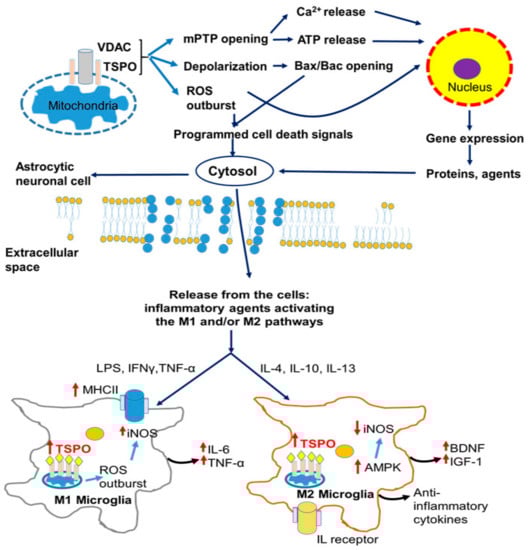 Intracellular manifestation of TBI in neurons and astrocytes, resulting in microglial activation. A vicious cycle of cell death and activation associated with enhanced TSPO responses’ expression in brain injury is reflected by cellular apoptosis and necrosis attained by way of mPTP opening and a decrease of intraneuronal ATP, which consequently triggers the neuroinflammatory response by microglial activation. Proinflammatory (M1) microglial phenotype activated by LPS, TNF-α, or IFNγ stimulation, and characterized by the expression of iNOS, MHCII, and significantly increased TSPO BP, contribute to ROS overproduction and the secretion of injury-mediated cytokines. The anti-inflammatory (M2) microglial phenotype is stimulated by interleukins (IL-4, IL-10, IL-13) and characterized by the secretion of BDNF, IGF-1, and anti-inflammatory cytokines. On the one hand, based on our various studies, we arrive a the assumption that mitochondrial membrane depolarization leads to programmed cell death; on the other hand, less pronounced effects on the mitochondrial membrane potential, but still allowing for ROS generation, and Ca2+ and ATP release into the cytosol, will lead to gene expression modulation that is part of: Microglial activation, astrocytic activation, neuronal and astrocytic cell death, neuronal (re) generation, angiogenesis, and wound healing [13]. Abbreviations: AD—Alzheimer’s disease; AMPK-5′—AMP-activated protein kinase; BDNF—brain derived neutrophic factor; BPAD—Bipolar affective disorder; HD—Huntington’s disease; IFNγ—Interferon gamma; IGF1—Insulin growth factor 1; IL—Interleukin; iNOS—Inducible nitric oxide synthase; LPS—Lipopolysaccharide; MDD—Major depressive disorder; MHCII—Major histocompatibility complex protein class II; mPTP—Mitochondrial permeability transition pore; PD—Parkinson’s disease; SCZ—Schizophrenia; TNF-α—Tumor necrosis factor alpha.