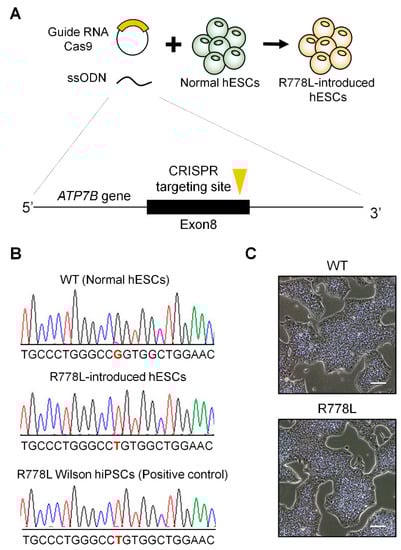 Introduction of R778L mutation into normal human embryonic stem cells (hESCs): (A) Graphical strategy showing the whole process of genetic model establishment harboring R778L mutation in ATP7B using Clustered Regularly Interspaced Short Palindromic Repeats (CRISPR)/Cas9 system. To introduce R778L mutation, hESCs were transfected with specifically designed single-guide RNAs (sgRNAs) and single-stranded oligodeoxynucleotides (ssODNs), simultaneously. (B) Sequencing analysis to verify successful genome editing: Single nucleotide substitution (c.2333G>T, Substitution, position 2333, from G to T) was confirmed in R778L-introduced hESCs. (C) Representative images of wildtype (WT) and R778L-introduced hESCs: R778L-introduced hESCs did not disturb the classical morphology of hESCs, a cobblestone shape with a clear boundary. Scale bar, 100 µm. WT, WT hESCs; R778L, R778L-introduced hESCs.