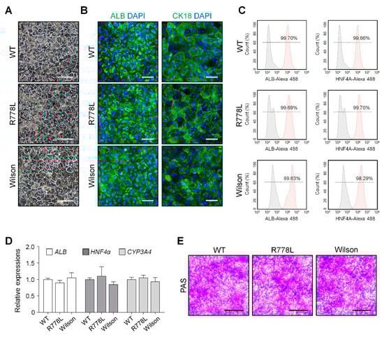 Hepatic differentiation of WT hESCs, R778L-introduced hESCs, and Wilson hiPSCs: (A) Representative images of WT-HLCs and R778L-introduced HLCs, and Wilson hiPSC-HLCs. Differentiated HLCs hepatocytes are arranged in hexagonal morphology. Scale bar, 100 µm. (B) Immunostaining of albumin (ALB, cytosolic protein) and cytoskeletal 18 (CK18, plasma membrane protein) was performed in differentiated HLCs. DAPI (4′,6-diamidino-2-phenylindole) showed nuclear counterstaining (blue). Scale bar, 50 µm. (C) Flow cytometric analysis on the expression levels of ALB and hepatocyte nuclear factor 4α (HNF4A). Differentiated HLCs exhibited high purity (>99% of ALB and HNF4A-positive cells). (D) Relative expression of hepatocyte-specific genes ALB, HNF4A, and CYP3A4 in differentiated HLCs. Expression levels were determined by real-time PCR, normalized by GAPDH, and expressed as a fold change relative to the expression level in WT. The data are presented as the mean ± SE of three independent experiments. (E) Representative images of Periodic Acid-Schiff (PAS) staining in WT-HLCs, R778L-introduced HLCs, and Wilson hiPSC-HLCs. Glycogen storage assessed by PAS staining showed a similar level. Scale bar, 100 µm. WT, WT-derived HLCs; R778L, R778L-introduced-derived HLCs; Wilson, Wilson hiPSC-derived HLCs.
