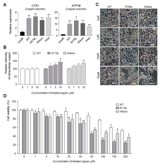 The main cause of hepatic failure in Wilson’s patients is hepatic toxicity caused by the disability of copper export from the liver [26,27]. In order to figure out this in the hESC-derived Wilson’s disease model, copper chloride was further supplemented in culture (from 0 μM to 50 μM) and the toxic effect of copper ion in the WT-HLCs and R778L-introduced HLCs were tested and compared with the copper toxicity in Wilson hiPSC-HLCs (Figure 3C). Treatment of copper chloride did not affect the morphological changes in WT-HLCs; however, massive cell death was detected in R778L-introduced HLCs at 50 µM of copper chloride treatment as shown in Wilson hiPSC-HLCs, indicating the high vulnerability against the copper ion was resulted from the introduction of R778L mutation in WT.