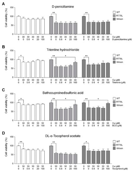 We tested the model as a cell-based platform for assessing several therapeutic agents: D-penicillamine (DPA) is currently the most widely used copper chelating agents. DPA removes heavy metals like copper and iron by generating stable complexes, but sometimes, it had adverse effects [11,35,36]. Trientine hydrochloride (Trientine) emerged as an alternative for the patients who had DPA intolerance. Trientine has a similar mode of action but has a different clinical outcome when administrated to Wilson’s patients [27,36,37]. For another copper chelating agent, we chose bathocuproinedisulfonic acid (BCS) that is frequently used in many kinds of experiments to deplete copper ions. DL-α-tocopheryl acetate (vitamin E) known to relieve the oxidative stress was also selected because it might play a central role in the pathogenesis of Wilson’s disease by reducing oxidative stress [38,39].