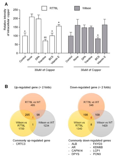 Analysis of intracellular copper levels and transcriptome of Wilson’s disease HLCs: (A) Several copper chelating agents were treated at a concentration of 100 μM in the presence of 30 μM of copper chloride. Fluorescence intensities measured using copperGREEN were represented in the graph as a relative value to the intensity level in control group of R778L and Wilson, respectively. The data are presented as the mean ± SE of three independent experiments; * p < 0.05; ** p < 0.01. WT, WT-derived-HLCs; R778L, R778L-introduced-derived HLCs; Wilson, Wilson hiPSC-derived-HLCs; DPA, D-penicillamine; Trientine, Trientine hydrochloride; BCS, bathocuproinedisulfonic acid disodium salt; Vitamin E, DL-α-tocopheryl acetate. (B) Analysis of commonly upregulated and downregulated genes in Wilson’s disease HLCs compared to WT-HLCs.
