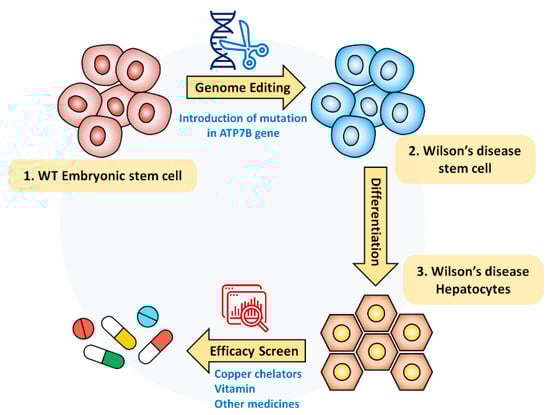 Human pluripotent stem cells (hPSCs) including human embryonic stem cells (hESCs) and human-induced pluripotent stem cells (hiPSCs) could provide an invaluable cell source to model human disease because their self-renewal ability and differentiation capability [12,13,14,15]. In fact, several studies demonstrated the hepatic differentiation and disease phenotypes of differentiated hepatocyte-like cells (HLCs) from the patient-derived hiPSCs for modeling Wilson’s disease [16,17,18]. However, there is a limitation in the modeling genetic disease including Wilson’s disease with patient somatic cell-derived hiPSCs due to the disease’s rarity.