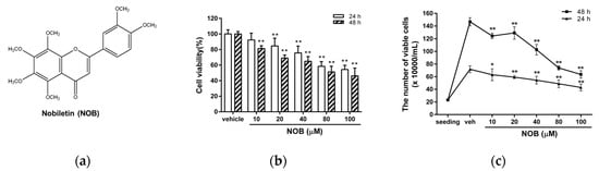 Effects of nobiletin (NOB) on the cell growth of K562 cells. (a) The chemical structure of nobiletin (5,6,7,8,3′,4′-hexamethoxyflavone, NOB). (b) K562 cells were treated with vehicle (0.1% DMSO) or NOB (10-100 μM) for 24 h or 48 h. Cell viability was measured using an MTT assay. (c) Cells at an initial seeding concentration of 2 × 105/mL were incubated with NOB (10-100 μM) for 24 h or 48 h. The cell numbers were measured by counting of viable cells using trypan blue staining. The experiments were repeated three times. These data represent the mean ± SD of three independent experiments. *p < 0.05 and **p < 0.01 represent significant differences compared with the vehicle-treated cells (veh).
