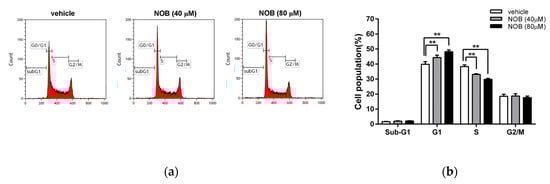 Cell cycle distribution was determined by flow cytometry analysis as previously described [27]. Cells were seeded on a 6-well plate and treated with vehicle or NOB for 48 h. Cells were collected and washed twice in ice-cold phosphate-buffered saline (PBS), fixed in 70% ethanol in PBS and stored at −20 °C for more than 24 h. Cells were washed in ice-cold PBS and incubated with propidium iodide (PI) staining buffer (20 μg/mL PI, 200 μg/mL RNaseA and 0.1% Triton X-100 in PBS) at room temperature for 30 min. Cell cycle distribution was measured using the FACSCalibur and analyzed by Cell Quest Pro software (BD Biosciences, San Jose, CA, USA).